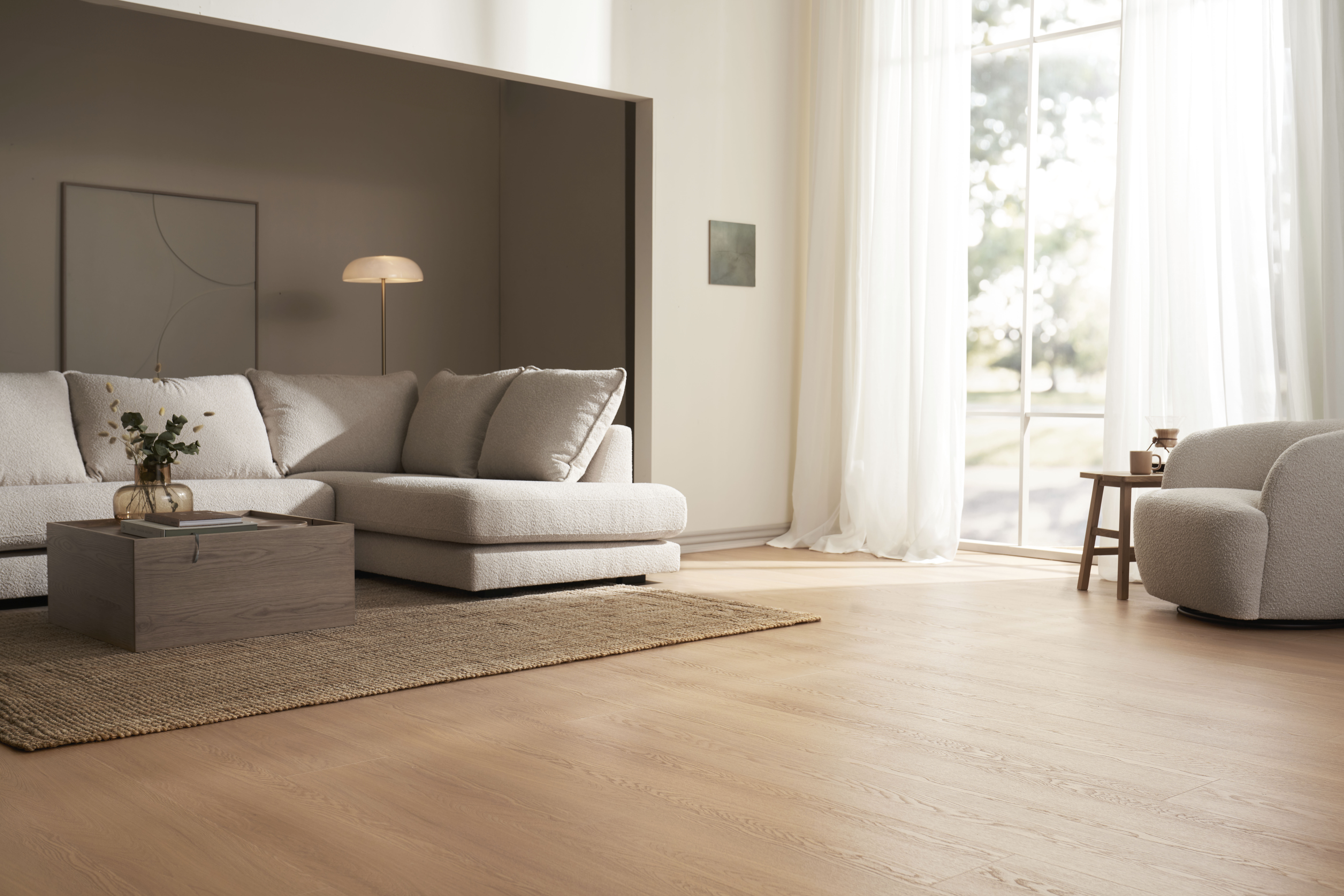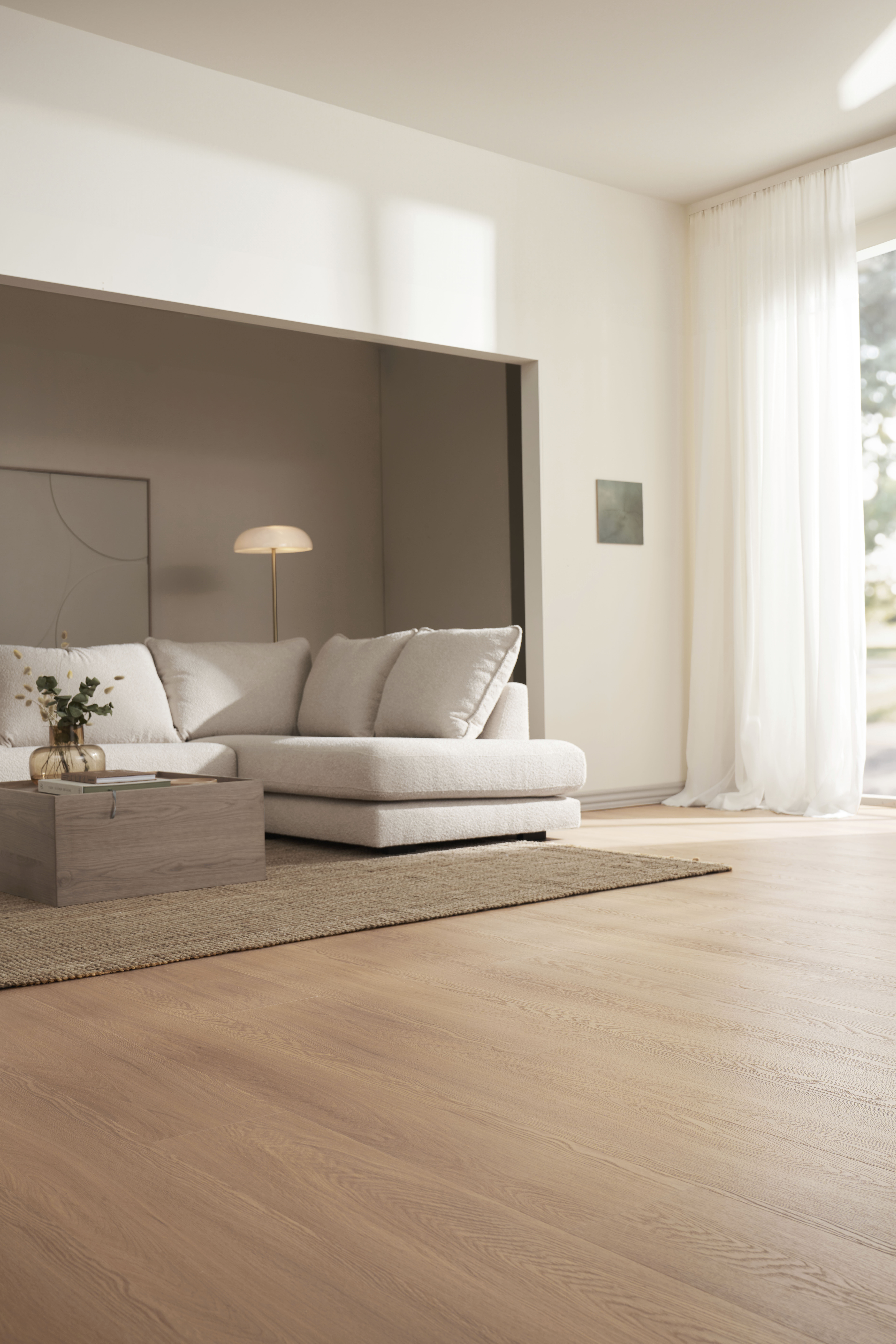 Med Impressive designgulv fås et slidstærkt gulv med 0,70 mm kraftigt slidlag og kork på bagsiden, - og så er det godkendt til montering gennem døråbninger.