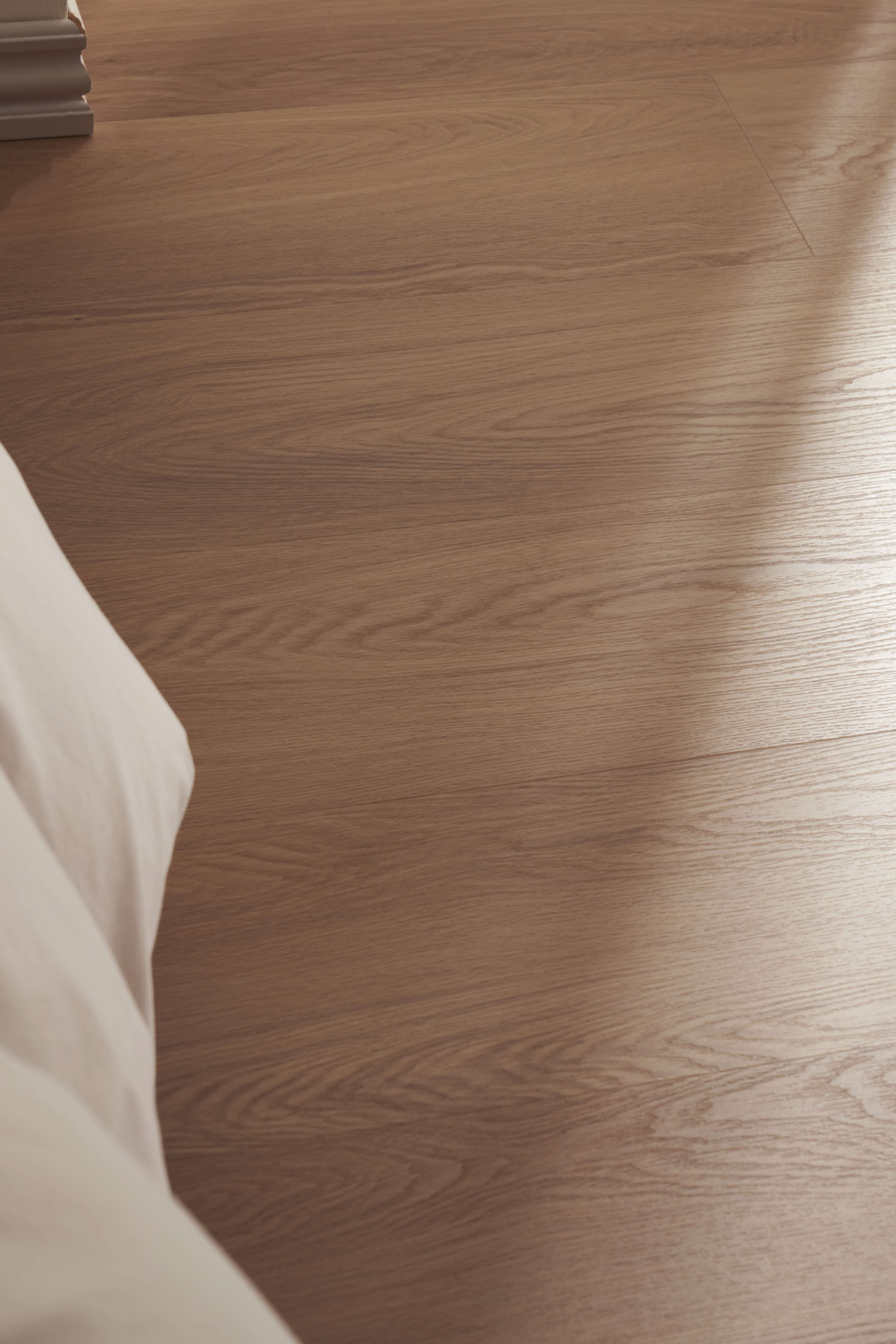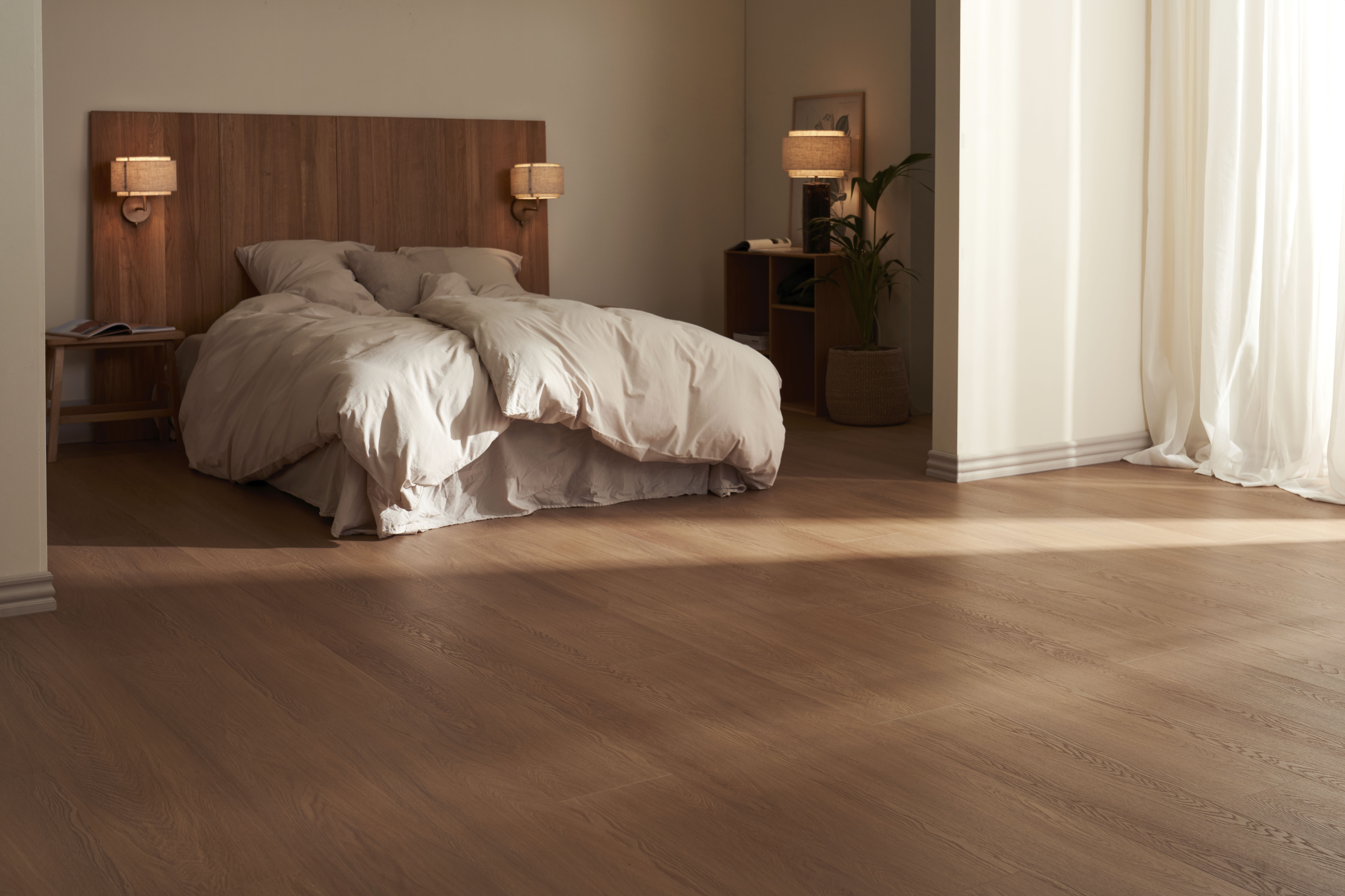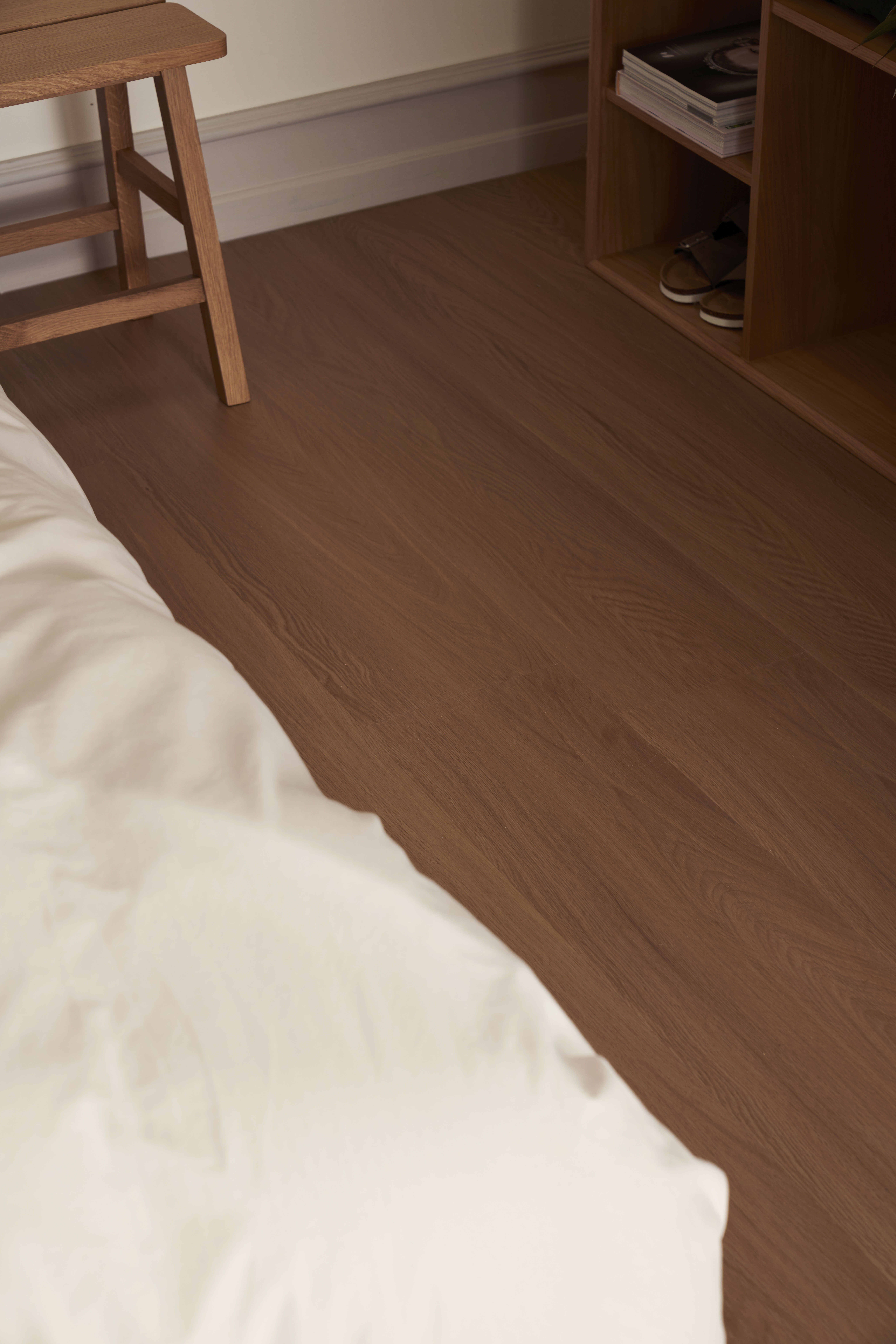 Med Impressive designgulv fås et slidstærkt gulv med 0,70 mm kraftigt slidlag og kork på bagsiden, - og så er det godkendt til montering gennem døråbninger.