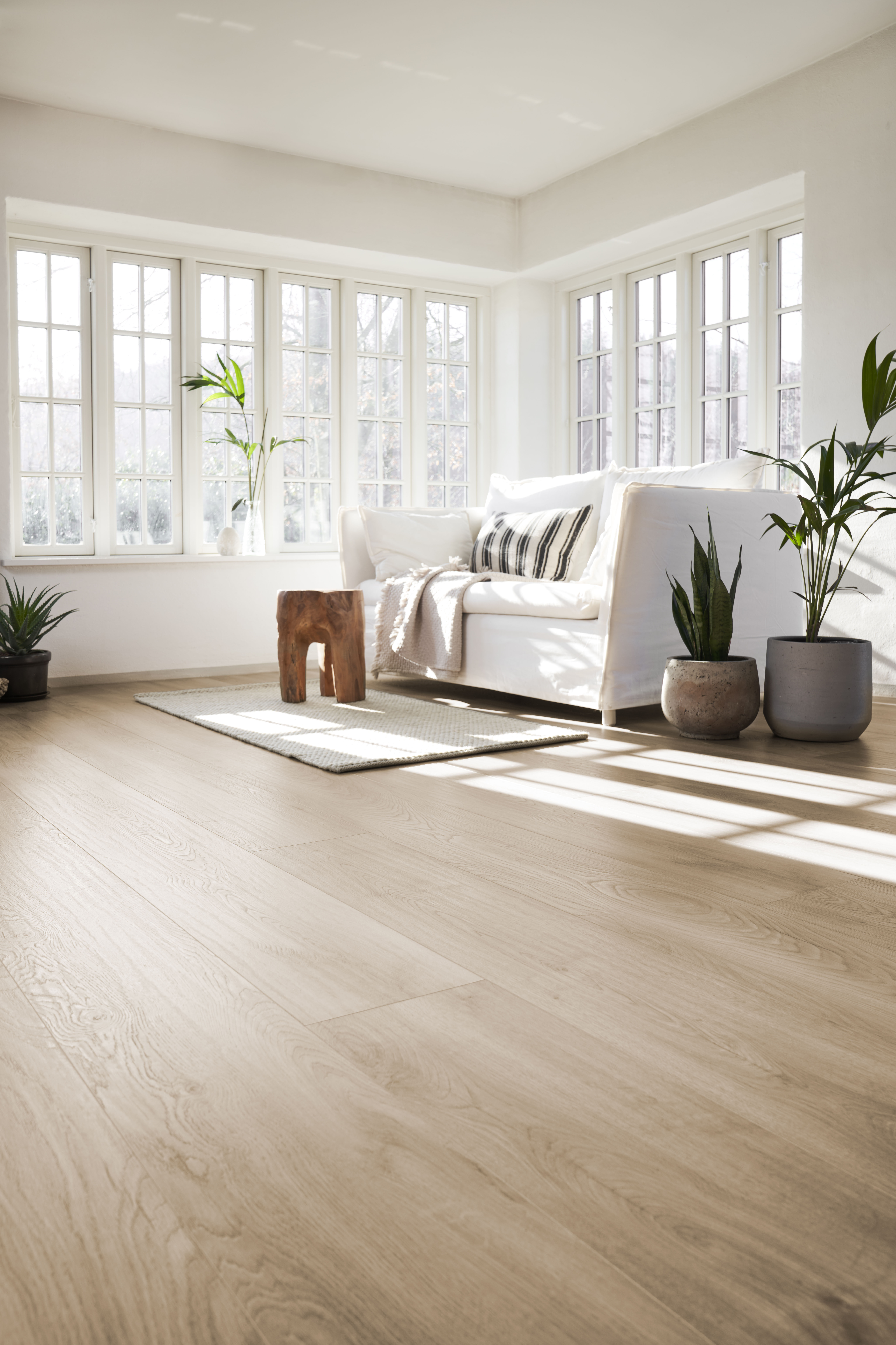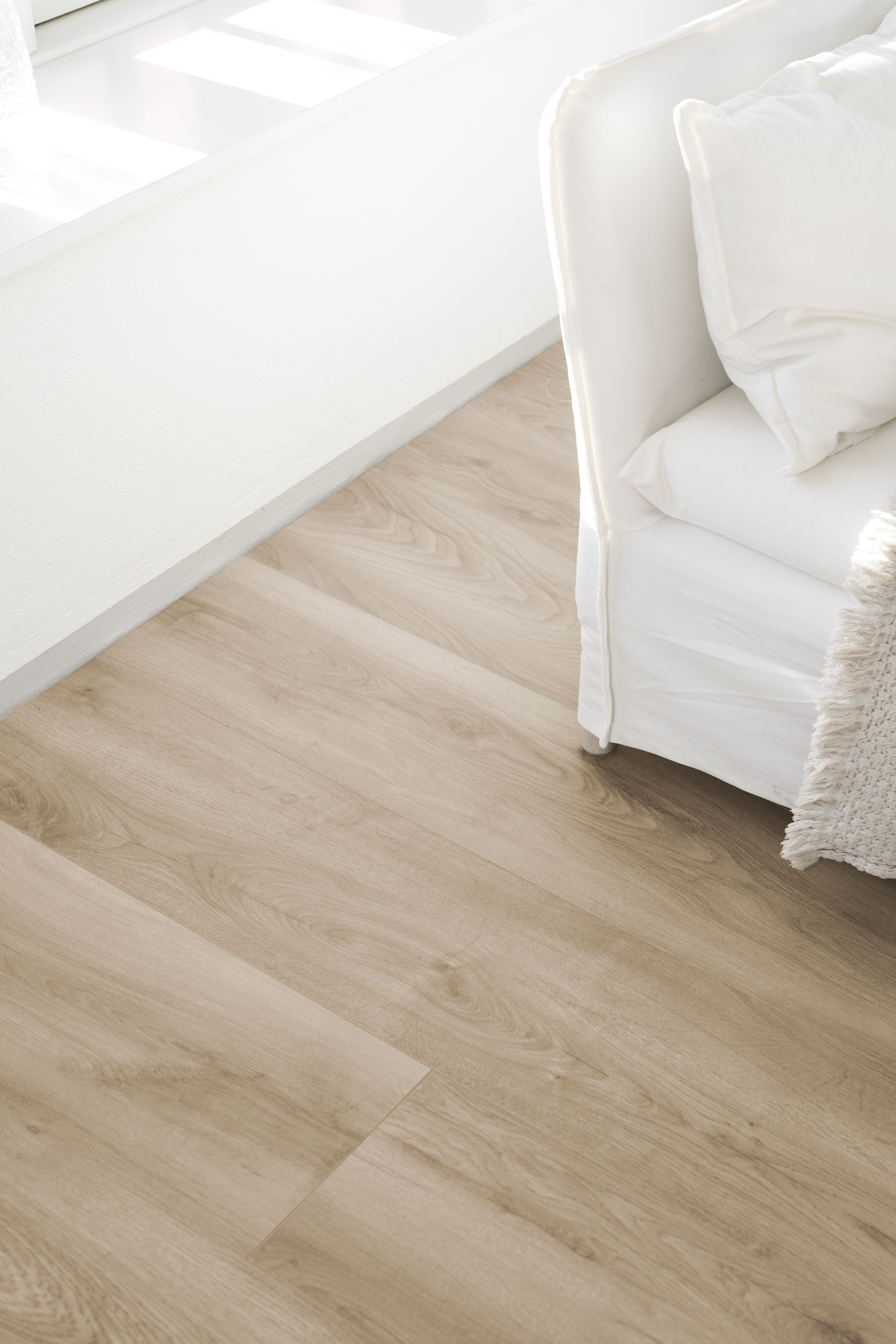 Den integrerede og bæredygtige korkbagside forbedrer akustikken i rummet og giver en god gangkomfort. Endnu et plus er, at gulvet dæmper lyden med mere en 40% ift. laminatgulve. Plankerne er lange og brede med en naturtro PVC-fri 3D HP overflade, har høj slidstyrke og holdbarhed. Det specialudviklede organiske kernemateriale af træfibre tåler vand og gør gulvet mere modstandsdygtig overfor fugt. Monteres nemt med 1clic2go PURE+ kliksystem, og kan lægges i store arealer på op til 20×20 meter.