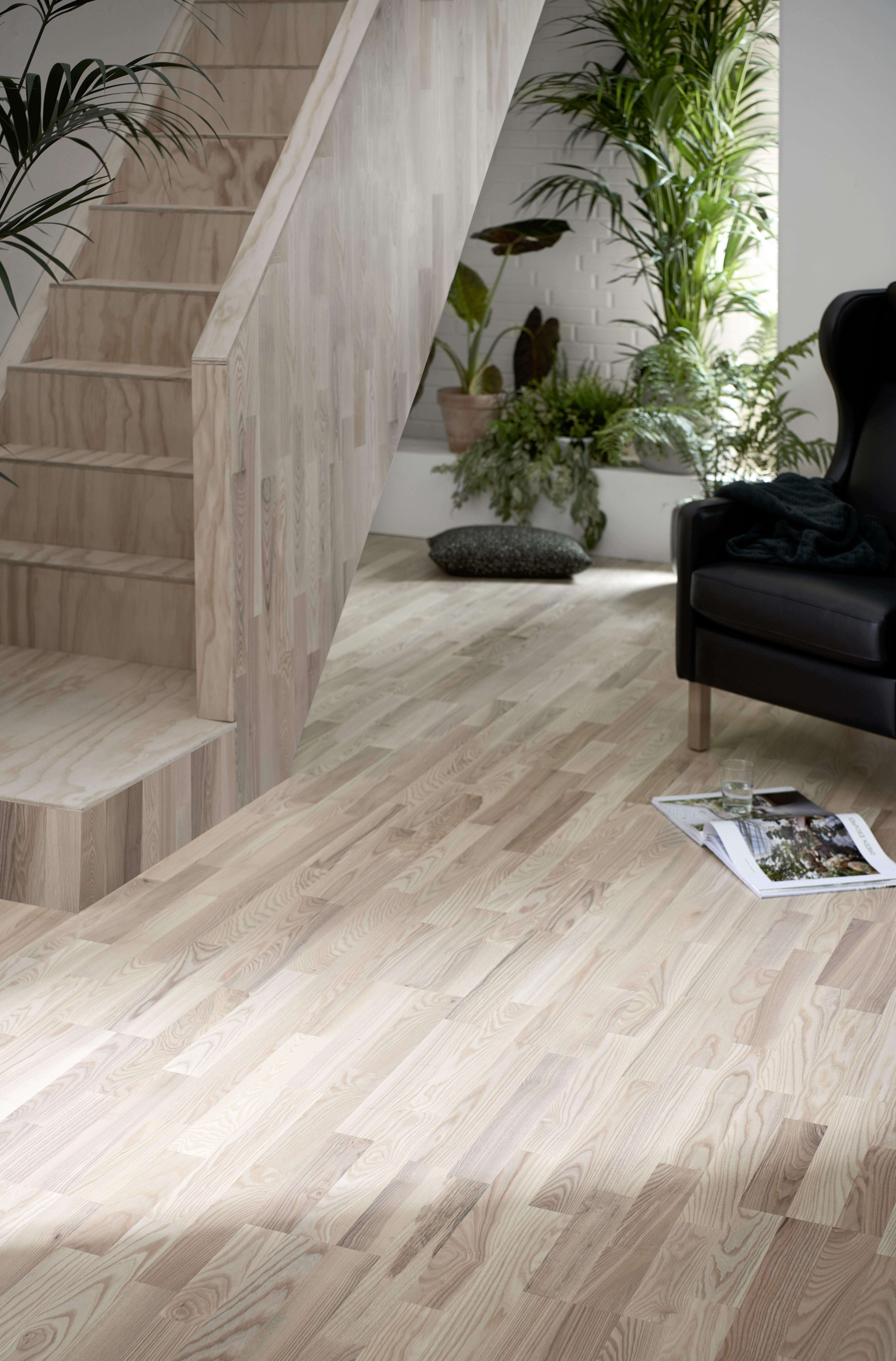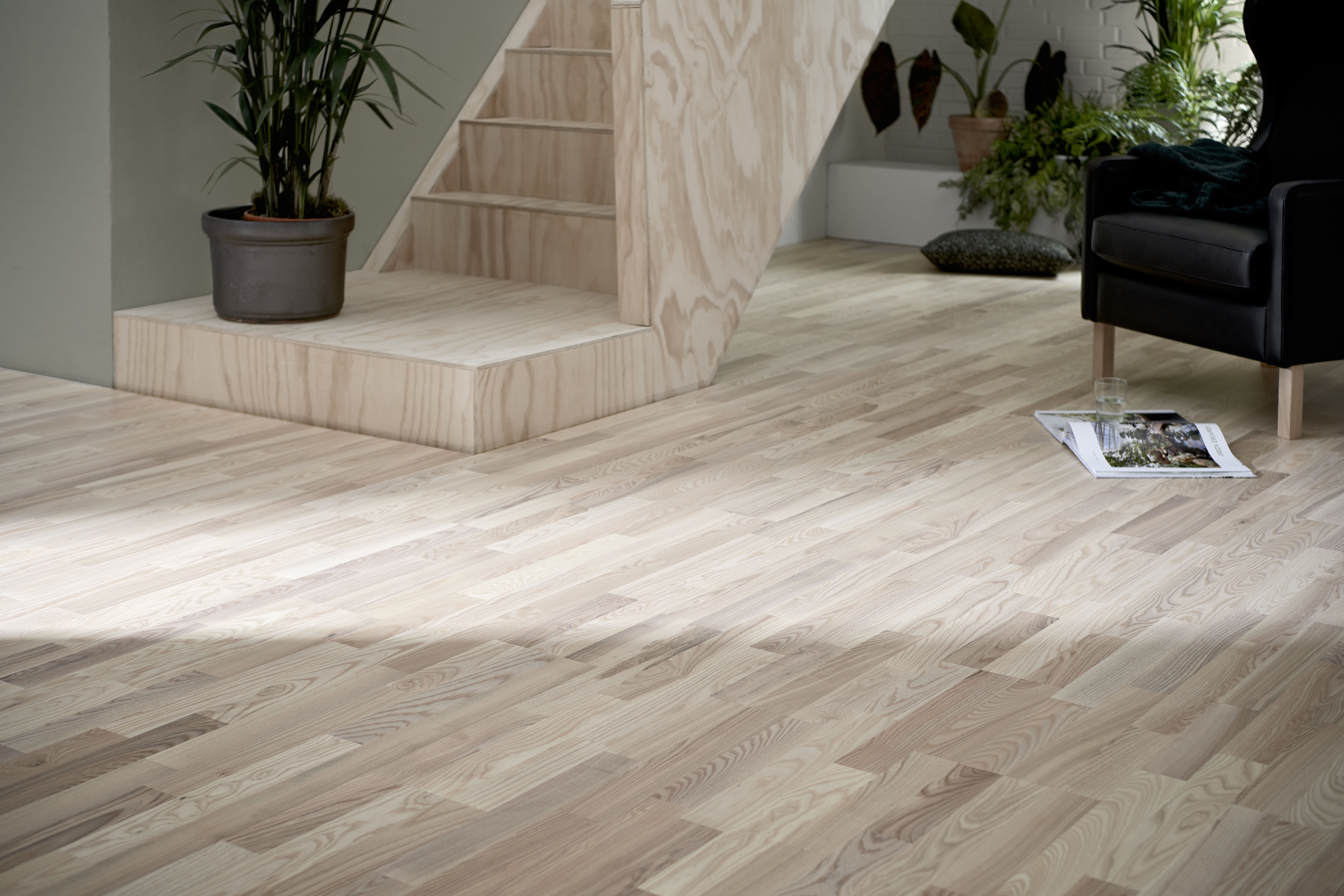 Klassisk og tidløst 3-stavs lamelparket i eg eller ask, der hver især bidrager med unik karakter.