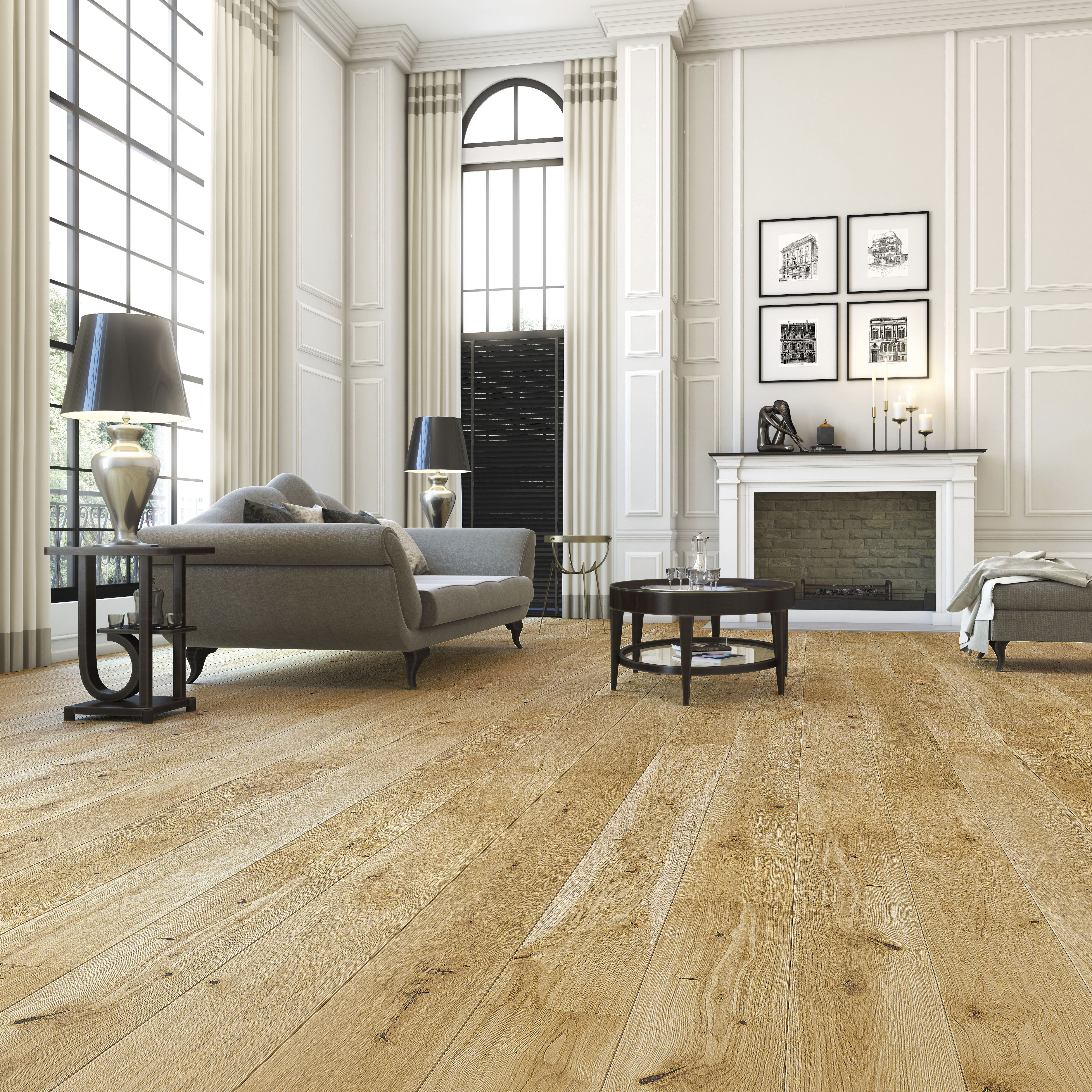 Klassiske, brede ege lamelplanker med børstet overflade og naturligt udtryk. FSC® certificeret, velegnet til gulvvarme og nem montering med 5G kliksystem.
